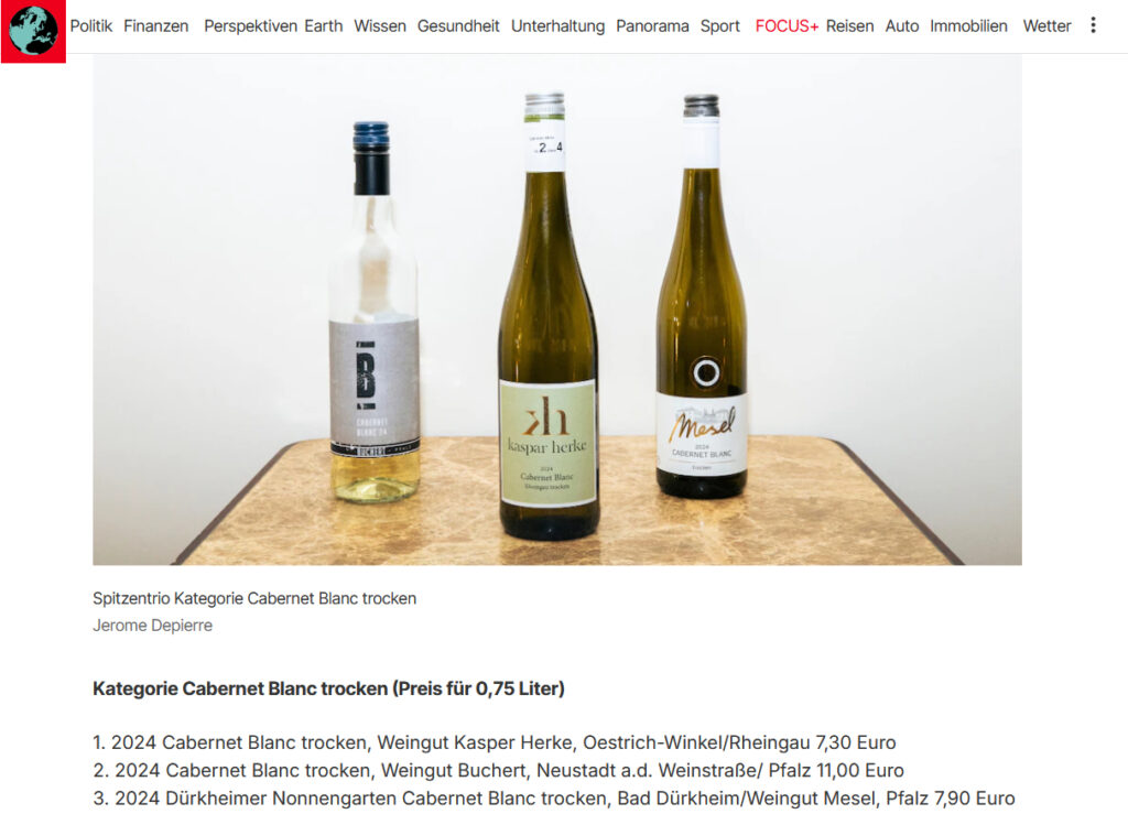 Wir freuen uns riesig, dass wir im Burda FOCUS Test mit unserem Cabernet Blanc den ersten Platz belegt haben. Diese Auszeichnung bestätigt unsere Arbeit und Leidenschaft für Qualität – ein großartiger Erfolg, über den wir sehr stolz sind.